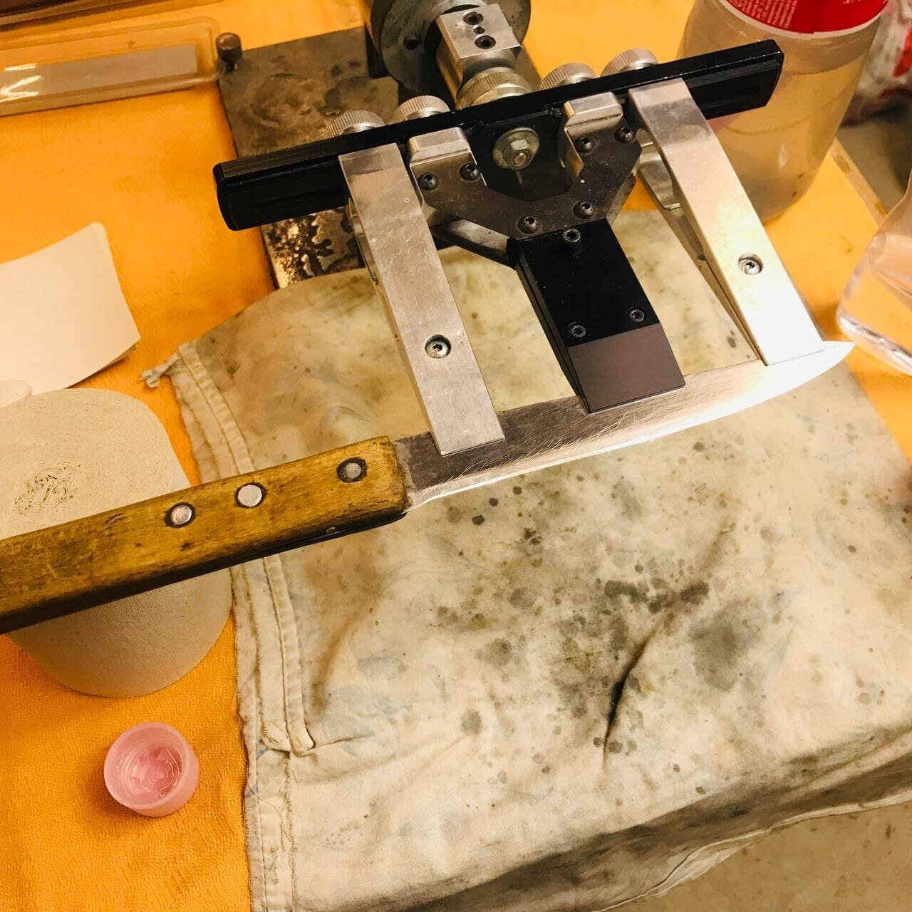 На фото видно, что у меня распечатаны камни от 150 до 600, а 1000й в упаковке. Это связано с тем, что его я даже не доставал и использовать для данного ножа не считаю целесообразным. Хороший рез и приемлемую стойкость режущей кромки обеспечивает камень F600 и на нём вполне можно остановиться в заточке домашней кухни. У меня распечатан камень F150 и им я формировал подводы, но это вполне можно сделать камнем F220, будет подольше, но не сильно.
